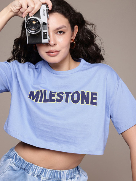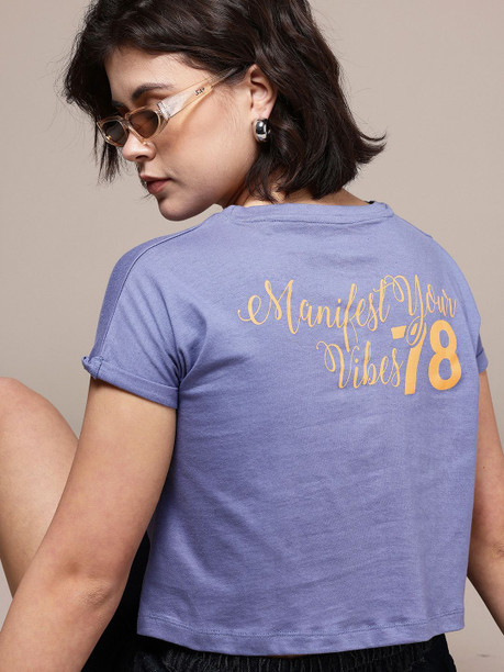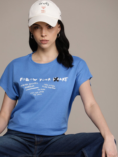 Women Typography Round Neck Cotton Blend Blue T-Shirt