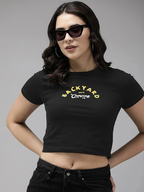 Women Self Design Round Neck Cotton Blend Black T-Shirt