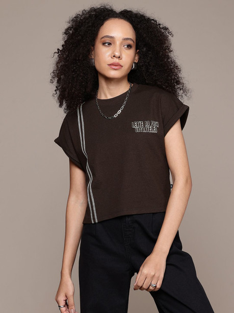 Women Printed Round Neck Cotton Blend Brown T-Shirt