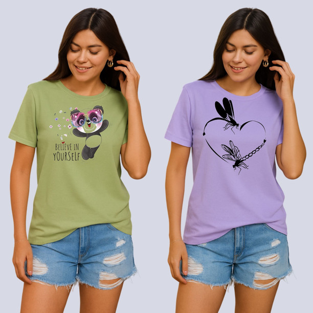 Women Printed Round Neck Polyester Green, Purple T-Shir...