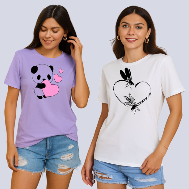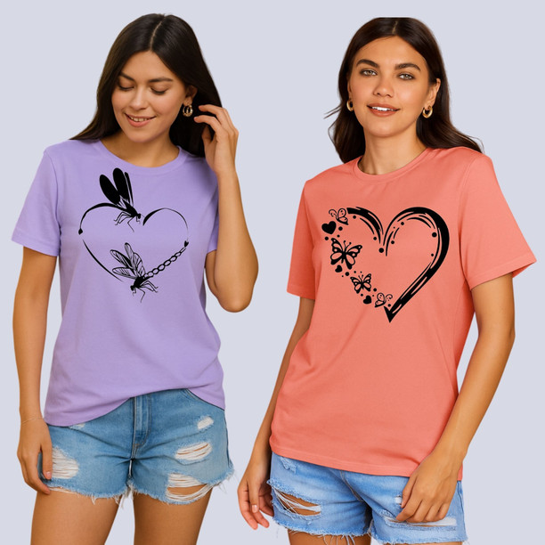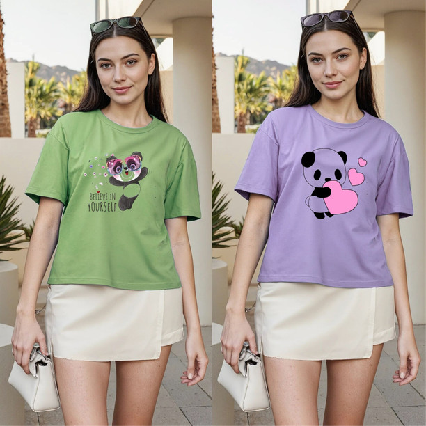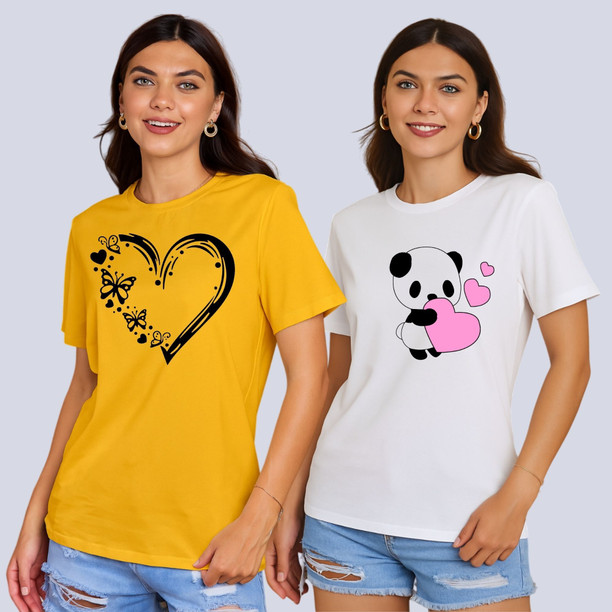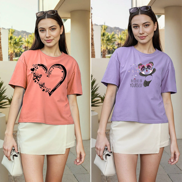 Pack of 2 Women Graphic Print Round Neck Polyester Pink...
