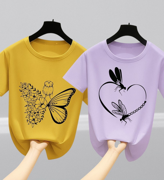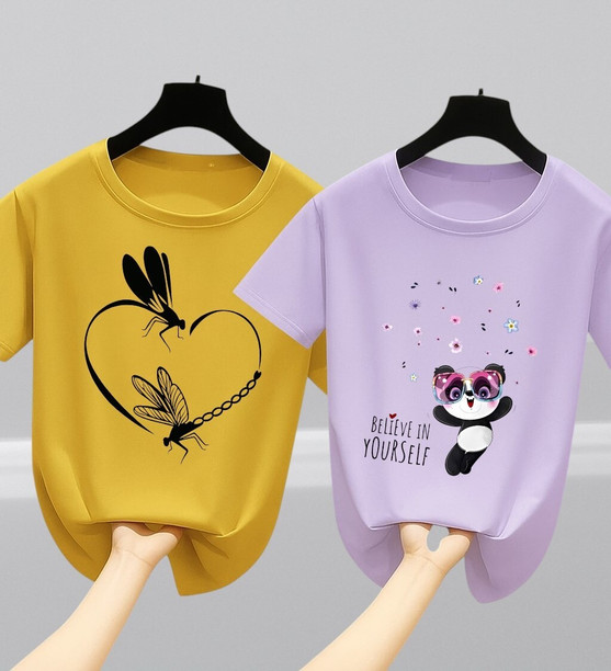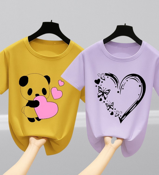 Women Printed Round Neck Polyester Yellow, Purple T-Shi...