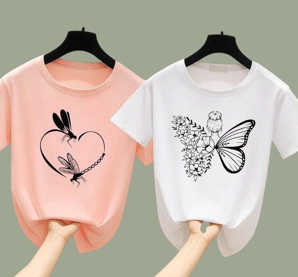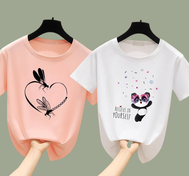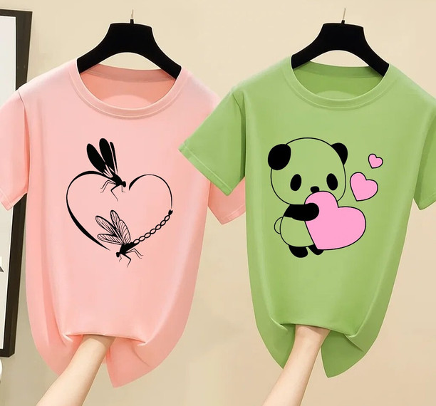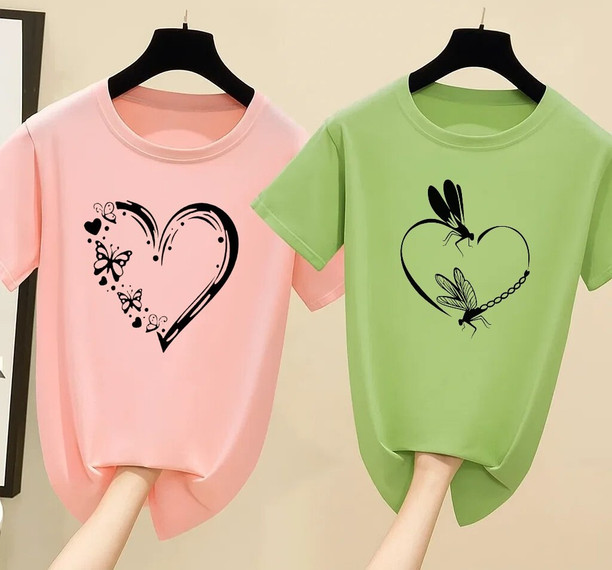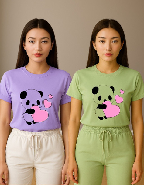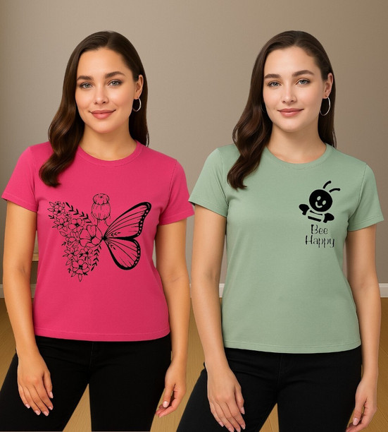 Women Printed Round Neck Polyester Pink, Green T-Shirt