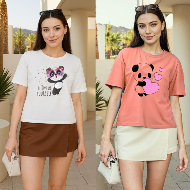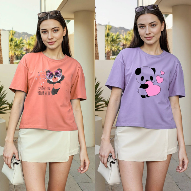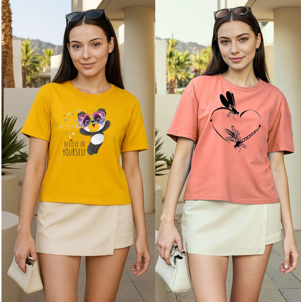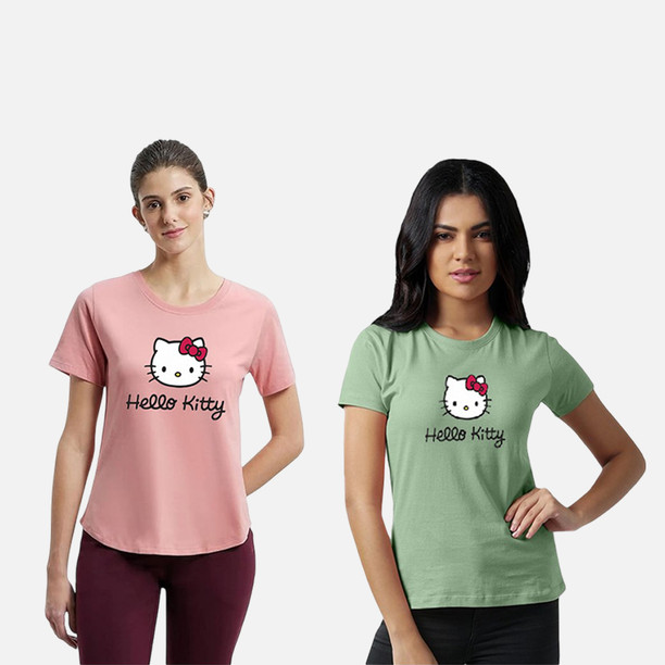 Pack of 2 Women Graphic Print Round Neck Polyester Pink...
