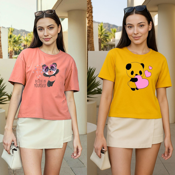 Women Printed Round Neck Polyester Yellow, Pink T-Shirt