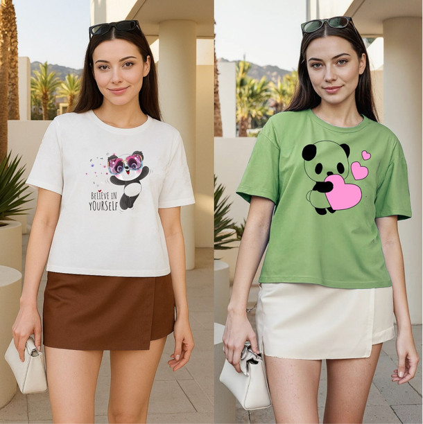 Women Printed Round Neck Polyester White, Green T-Shirt