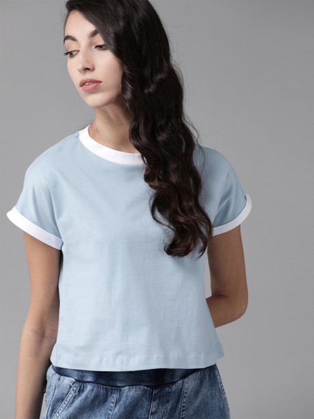 Women Solid Round Neck Pure Cotton Blue T-Shirt