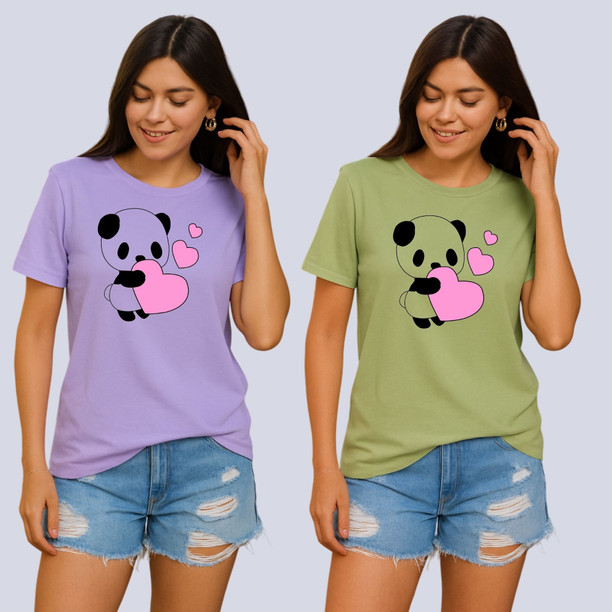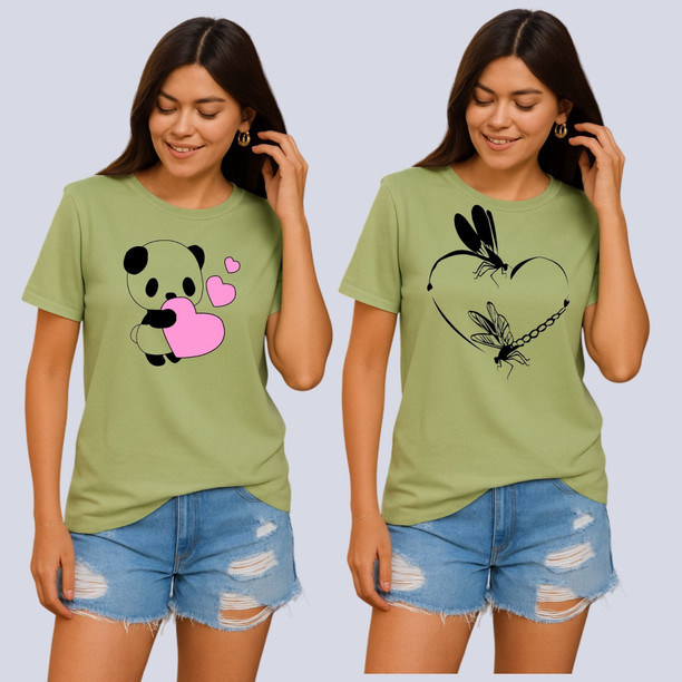 Women Printed Round Neck Polyester Pink, Green T-Shirt