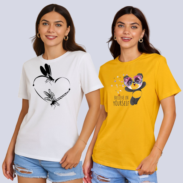 Women Printed Round Neck Polyester Yellow, White T-Shir...