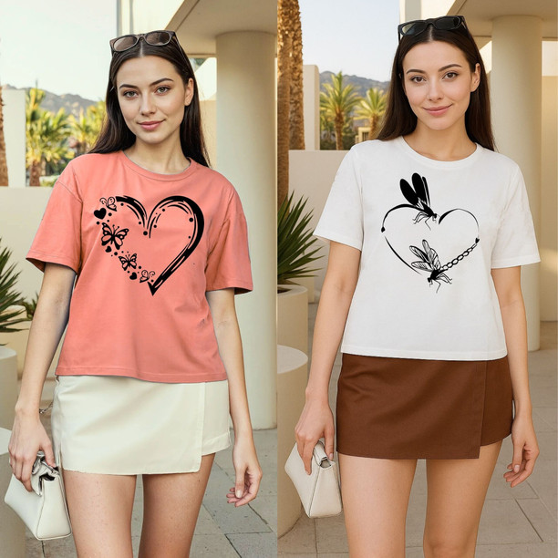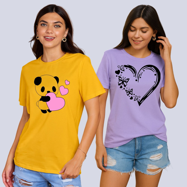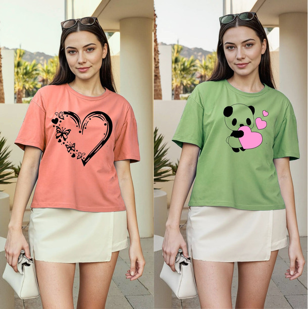 Pack of 2 Women Graphic Print Round Neck Polyester Pink...