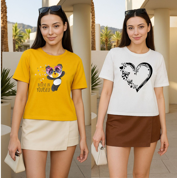 Pack of 2 Women Graphic Print Round Neck Polyester Whit...