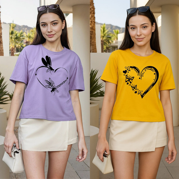 Pack of 2 Women Printed Round Neck Polyester Purple, Ye...